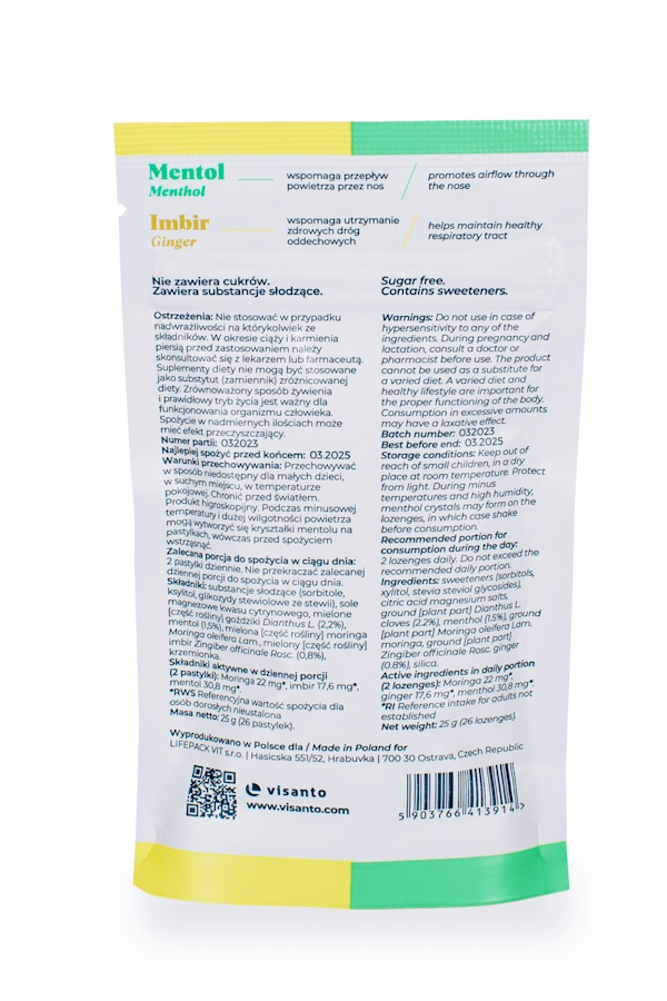 Składniki aktywne w dziennej porcji (2 pastylki): Moringa 22 mg*, imbir 17,6 mg*, mentol 30,8 mg*.