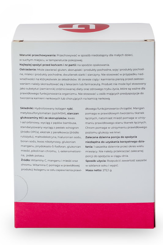Hydrolizowany kolagen rybi, metylosulfonylometan (optiMSM), siarczan glukozaminy KCl ze skorupiaków, kwas l-askorbinowy, wyciąg z pędów bambusa, standaryzowany wyciąg z pestek winogron (źródło OPCs), ekstrakt z perełkowca (źródło rutozydu), maltodekstryna, hialuronian sodu, boran sodu, kwas nikotynowy, glukonian manganu, pirydoksalo-5-fosforan, glukonian miedzi (II), pikolinian chromu, L-selenometionina, jodek potasu.