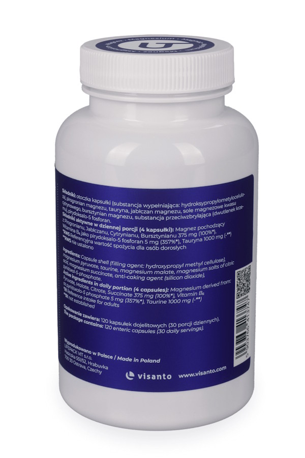 Magnez Visanto to zaawansowana formuła łącząca aż 4 organiczne formy magnezu: pirogronian, jabłczan, cytrynian i bursztynian, które zapewniają wysoką biodostępność. Ulegają także metabolizmowi do układów buforowych organizmu, przez co wspomagają utrzymanie gospodarki kwasowo-zasadowej. Ponadto dostarczają intermediaty cyklu Krebsa, który zostaje w ten sposób dodatkowo pobudzany, co stymuluje całą bioenergetykę organizmu.