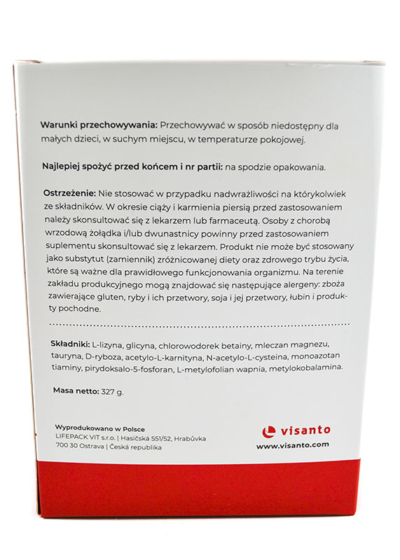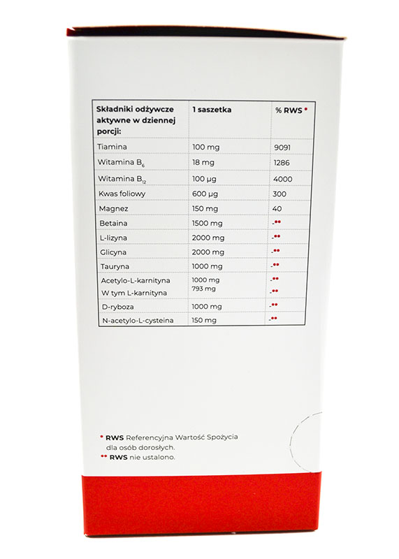 L-lizyna, glicyna, chlorowodorek betainy, mleczan magnezu, tauryna, D-ryboza, acetylo-L-karnityna, N-acetylo-L-cysteina, monoazotan tiaminy, pirydoksalo-5-fosforan, L-metylofolian wapnia, metylokobalamina.