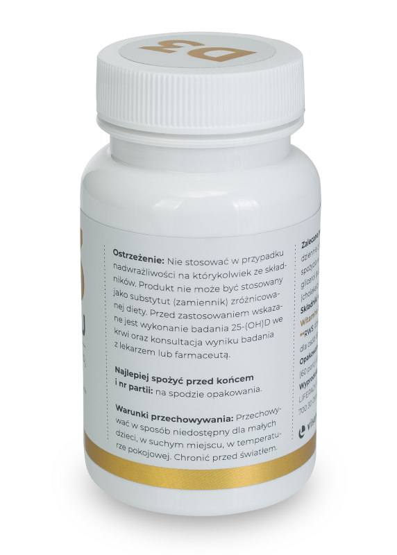 Nie stosować w przypadku nadwrażliwości na którykolwiek ze składników. Produkt nie może być stosowany jako substytut (zamiennik) zróżnicowanej diety. Przed zastosowaniem wskazane jest wykonanie badania 25-(OH)D we krwi oraz konsultacja wyniku badania z lekarzem lub farmaceutą.
