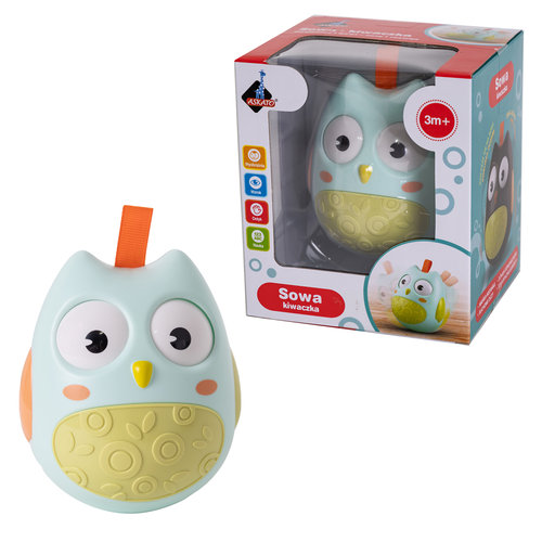 Sensoryczna zabawka - kiwająca sowa - nigdy się nie przewraca. Pomaga w rozwoju koordynacji ruchowej oraz zmysłów wzroku, dotyku i słuchu. Kołysząc się na wszystkie strony, porusza oczami i wydaje odgłosy dzwoneczków, przez co doskonale stymuluje i rozwija koordynację ruchowo-wzrokowo-słuchową. Zabawka wczesnorozwojowa, już na tym etapie zachęcająca do aktywności podczas leżenia na brzuszku, wyciągania rączek, podnoszenia główki. Wiek: 3 miesięcy Wymiar zabawki: 10x9x11 cm Wymiar opakowania: 14x12x16 cm