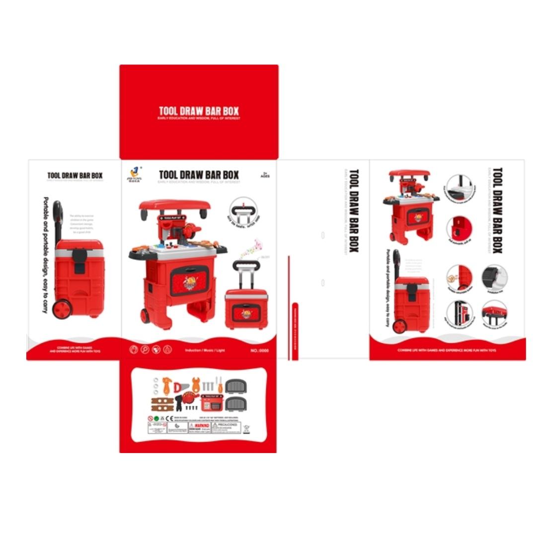 Wieloelementowy zestaw narzędzi zasilany bateriami. Zestaw zapakowany w wygodny walizkę na kółkach, służy również jako warsztat.