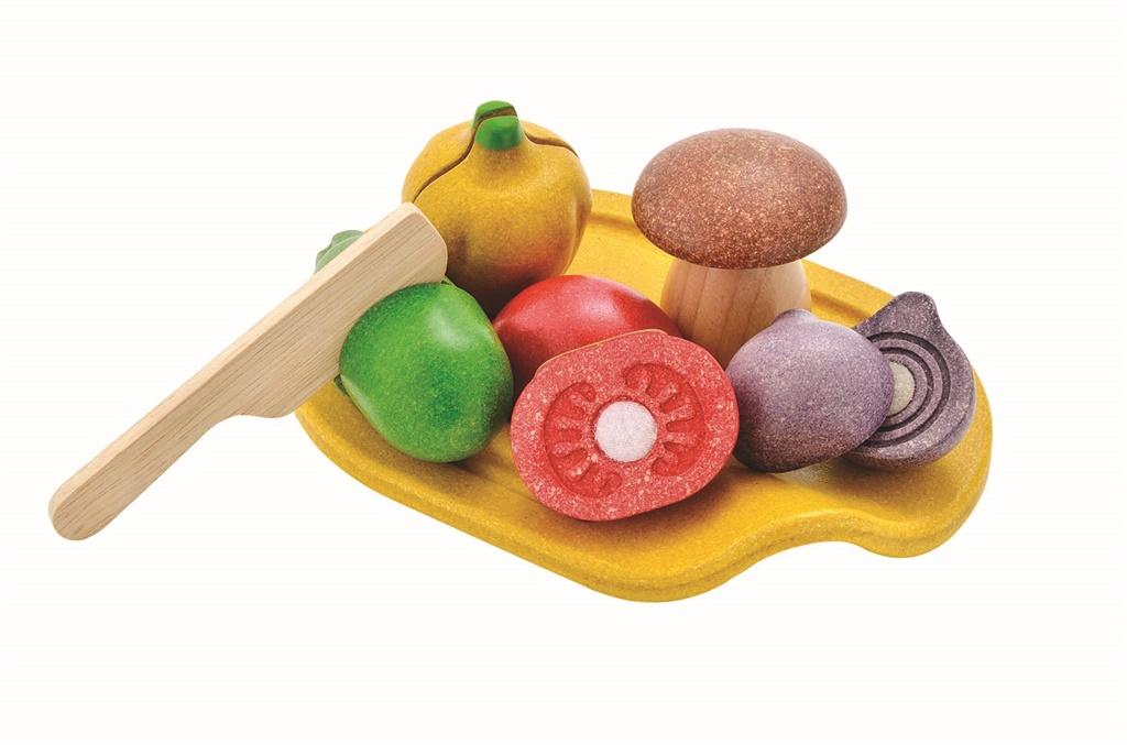 Zestaw smakowitych warzyw z nożykiem i deską do krojenia. Pomidor, papryka, szalotka, ogórek i grzybek mają w środku rzep, dzięki któremu można je kroić na pół i z powrotem składać w całość.