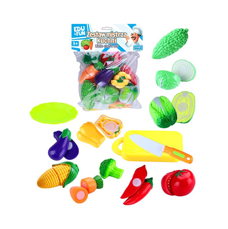 W zestawie: talerzyk, deska do krojenia, plastikowy nóż, 6 warzyw. Wiek: 3+ Wymiary opakowania: 24x21x9cm.