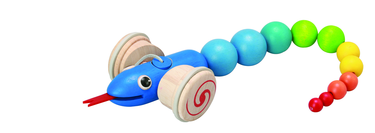 Drewniany, kolorowy wąż jedzie za dzieckiem ciągnącym go na sznurku, zabawnie kołysząc się na boki. Spacer z takim towarzyszem sprawi maluchowi przyjemność, zabawka przyciąga wzrok i zachęca do stawiania kolejnych kroków.