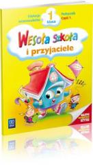 Cykl ""Wesoła szkoła i przyjaciele"" składa się z 5 części podręcznika, 5 części kart pracy, 2 części wyprawki, 5 części zeszytów orazpodręcznika z ćwiczeniami do zajęć komputerowych. Jest topodręcznik, w którym zarówno treści, jak i metody pracy zmieniają się zgodnie z potrzebami współczesnego nauczyciela i ucznia. Szereg poleceń dodatkowych, polecenia odwołujące się do wiedzy spoza podręcznika, a także do samodzielnych myśli i uczyć dziecka powodują, że książka zarówno pod względem formalnym, jak i aktualności treści i metod jest podręcznikiem zgodnym z najnowszymi kierunkami w pedagogice i psychologii.Część 1. podręcznika zawiera materiał przeznaczony na dwa pierwsze miesiące nauki. Kolorem niebieskim zaznaczono polecenia oraz teksty przeznaczone dla dzieci już czytających. Kolorem czarnym zaś- teksty dla dziecka dopiero poznającego litery oraz wyrazy do czytania globalnego. W tej części wprowadzono litery: o, a, i. Piktogramami oznaczono miejsca z dodatkowymi ćwiczeniami, a takżeodniesienia do tekstów w wyprawceinagrań na płycie CD-audio. Tematy zajęć koncentrują sięwokół treści bliskich dziecku (określanie kierunków w przestrzeni, bezpieczeństwo na drodze, jesień w ogrodzie i sadzie, las, ptaki odlatujące na zimę). Poruszane są również zagadnienia z edukacji matematycznej (wprowadzenie liczb 1 i 2),muzycznej, technicznej oraz plastyczneji społecznej.Podręcznik zawiera wszytą do środka książki wkładkę z kolorowymi nalepkami wielokrotnego użytku uzupełniającymi ćwiczenia w podręczniku oraz w kartach pracy. Książkę wzbogacają kolorowe, różnorodne w formie, ilustracje oraz fotografie.