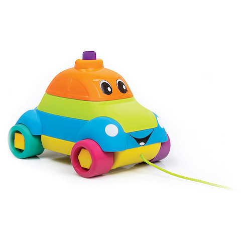 Wesołe Auto to zabawka sorter do ciągnięcia. Aby zbudować auto należy ułożyć elementy jeden na drugim. Przy montażu kół, należy znaleźć właściwy kształt.