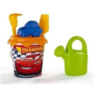 Zestaw zawiera wiaderko, łopatkę, grabki, konewkę, sitko i foremkę.