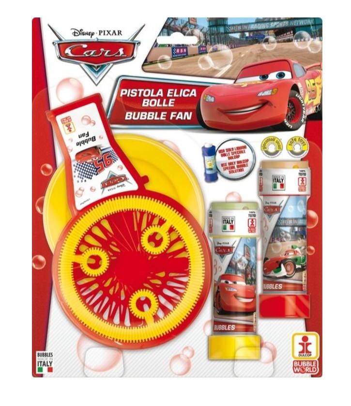 Duży wiatrak do robienia baniek mydlanych Cars wymiary blistra: 21 x 26 cm, wymiary wiatraka: 11.5 x 5.8 x 18.4 cm w zestawie 2 pojemniki baniek o pojemności 60 ml zasilanie: 3xAA (nie są dołączone do zestawu)