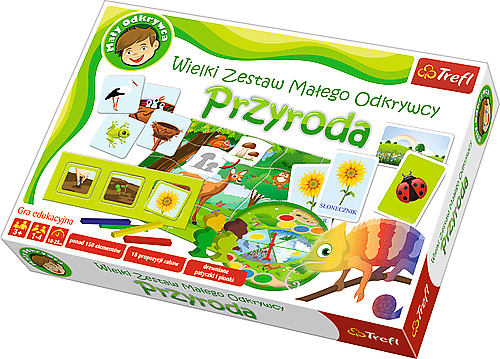 Przyroda to zbiór gier edukacyjnych, które w przyjazny sposób wprowadzają dziecko w świat natury i zmian zachodzących w przyrodzie. Dzieci uczą się nazw zwierząt i słownictwa z nimi związanego, nazw pór roku oraz przyporządkowania różnych czynności odpowiednim porom dnia. Gry i zabawy zawarte w zestawie pomagają kształtować i rozwijać zainteresowania przyrodnicze, a także stanowią dobrą podstawę w edukacji wczesnoszkolnej. W skład wchodzi: ponad 150 różnorodnych elementów, świetna zabawa zarówno w pojedynkę, jak i z całą rodziną, 18 propozycji gier i zabaw językowych dla najmłodszych, wysokiej jakości elementy drewniane, doskonały wstęp do nauki przyrody, idealne do domu i przedszkola.