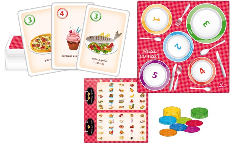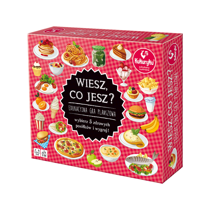 Aby „zdrowym być”, trzeba się prawidłowo odżywiać. „Wiesz, co jesz?” to doskonała recepta na zdrowie, a przy tym emocjonująca i wesoła zabawa dla dzieci i dorosłych. Podczas rozgrywki należy skompletować pięć kart z posiłkami. Wygra ten z graczy, który zdobędzie najwięcej punktów, a jego dania okażą się najbardziej wartościowe.