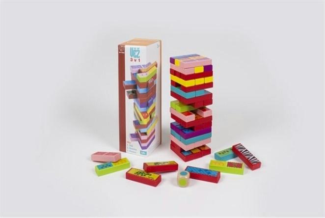 Gra 3 w 1 - jenga, domino i memory. Zawiera 52 kolorowe drewniane klocki. Wiek graczy: 3+ Liczba graczy: 2+ Czas rozgrywki: 20 minut