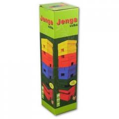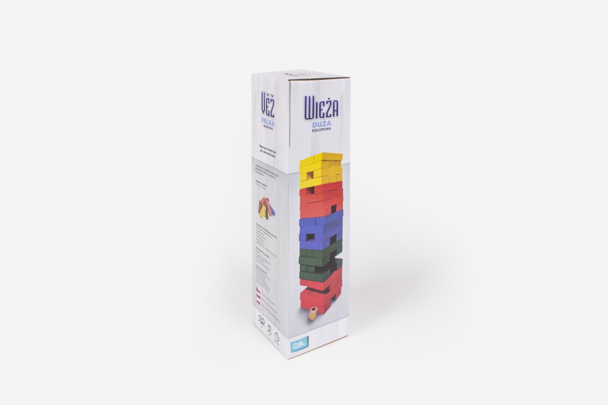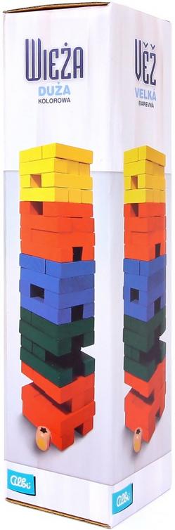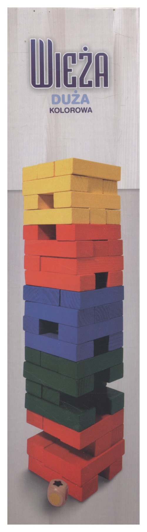Zestaw 60 kolorowych drewnianych klocków o wymiarach 7,5x1,5x2,5 cm do gry zręcznościowej. Gracz, który zburzył wieżę przegrywa. Wiek graczy: 6+ Liczba graczy: 2+ Czas rozgrywki: 20 minut