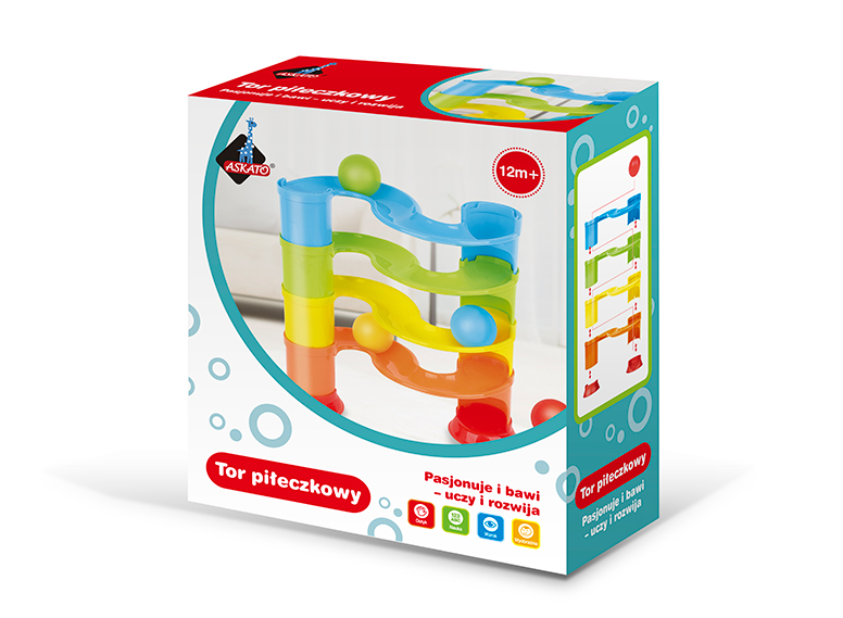 Idealna zabawka dla malucha. Dziecko na najwyższym poziomie toru kładzie kolorową piłeczkę i patrzy jak piłka toczy się po niższych poziomach. Zabawka pobudza ciekawość dziecka i daje dużo radości w łapaniu spadających piłeczek. tor 28x10x28 cm, 4 poziomy, 4 piłeczki. Wiek: 12m+ Wymiary opakowania: 24.5x11x28 cm