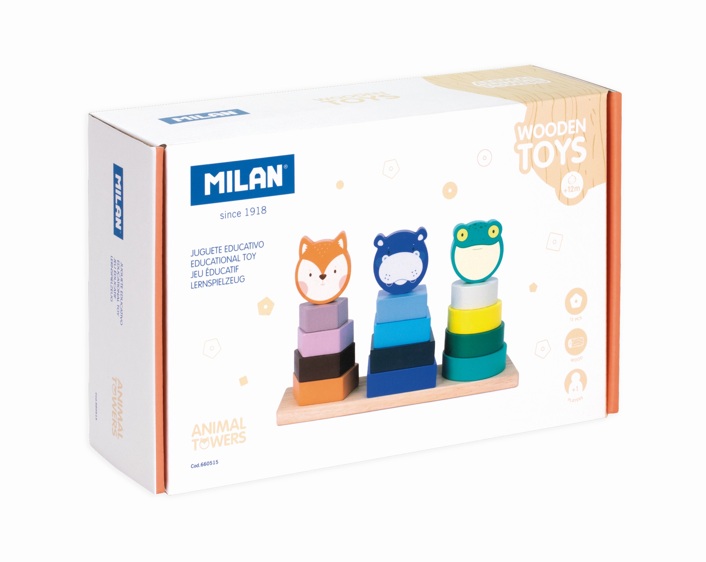 Drewniana zabawka edukacyjna "Wieża zwierząt". Idealna do nauki orientacji przestrzennej, postrzegania kolorów i kształtów. Zawiera 15 elementów do układania w 3 różnych kształtach i 3 drewniane drążki. Zachęca do rozwijania umiejętności motorycznych, logiki i koordynacji wzrokowej. Zalecane od 12 miesiąca życia.