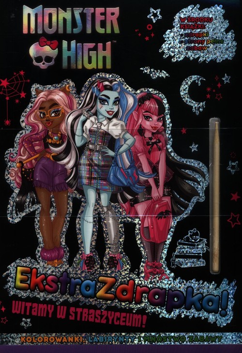 Monster High. Ekstrazdrapka to atrakcyjna książka wspomagająca zdolności manualne u dzieci. Zawiera kolorowanki, labirynty, kolorowe strony do zdrapywania oraz rysik. Wystarczy rysikiem zdrapać farbę, aby pojawiły się błyszczące obrazki lub wielobarwne ilustracje z potwornymi uczennicami.