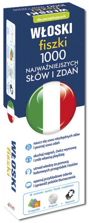 Włoski fiszki 1000 najważniejszych słów wraz z przykładowymi zdaniami to wyjątkowy zestaw, który tworzą: ponad 1000 ponumerowanych fiszek, płyta CD-ROM z nagraniami i programem oraz praktyczne pudełko z kolorowymi przegródkami. Nauka z kursem pozwala szybko i skutecznie opanować najczęściej używane w języku włoskim słówka. Opanowanie tego unikalnego zestawu umożliwia swobodną komunikację na poziomie podstawowym oraz czytanie ze zrozumieniem większości tekstów w języku włoskim. Przykłady użycia wszystkich słów w zdaniu to gotowe wzorce komunikacyjne. Fiszki podzielono na 40 praktycznych grup tematycznych, aby ułatwić zapamiętanie materiału metodą skojarzeń. Kolorowe przegródki pozwalają zaplanować naukę, a nagrania mp3 ułatwiają opanowanie prawidłowej wymowy.