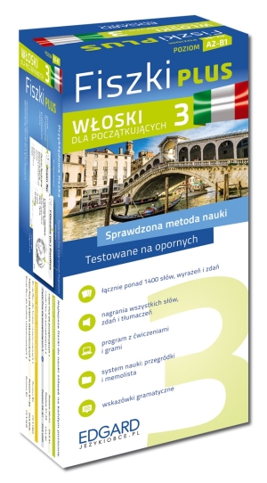 Włoski Fiszki PLUS dla początkujących 3 (A2-B1) to pakiet będący częścią rozbudowanego systemu nauki, dzięki któremu szybko i skutecznie nauczysz się słownictwa na każdym poziomie zaawansowania. Każdy zestaw Fiszek PLUS to starannie przygotowany materiał, wysokiej jakości nagrania wymowy wraz z programem komputerowym, memolistą i grami językowymi. Z Fiszkami PLUS nie tylko zapamiętujesz słówka, lecz także poznajesz słownictwo w kontekście, uczysz się nieregularnych form oraz popularnych zwrotów językowych. Od dziś nauka języka stanie się przyjemnością!- Ucz się 1400 słów, wyrażeń i przykładowych zdań - poznaj użycie gotowe wzorce komunikacyjne, utrwal reguły gramatyczne.- Poznaj prawidłowa wymowę. Słuchaj nagrań wszystkich słówek i zdań oraz ich tłumaczeń- Utrwalaj materiał z ćwiczeniami i grami językowymi dostępnymi w programie (do pobrania)- Ucz się skutecznie dzięki systemowi kolorowych przegródek. Sprawdź na memoliście, które słówka już znasz!- Twórz własne playlisty nagrań wymowy i ucz się mobilnie - w drodze do pracy lub szkoły!W zestawie znajdują się: 600 fiszek + program i nagrania do pobrania + kolorowe przegródki + etuiFiszki PLUS to rozbudowana seria fiszek, ułożona w wygodny system, dzięki któremu sam decydujesz, od którego poziomu zacząć naukę. W ramach serii dostępne są wszystkie trzy poziomy zaawansowania - początkujący, średnio zaawansowany i zaawansowany.Aby ułatwić wybór fiszek, każdy z trzech poziomów (podstawowy, średnio zaawansowany i zaawansowany) podzielono na trzy kolejne zestawy: 1, 2, 3 tak byś jak najlepiej dobrał najlepsze dla siebie fiszki i z łatwością mógł zdecydować o wyborze kolejnego zestawu.