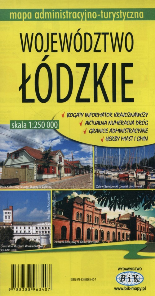 Na odwrocie opisy uwzględniające walory krajoznawczo-turystyczne: województwa łódzkiego, powiatów, ważniejszych miejscowości oraz 7 parków krajobrazowych.