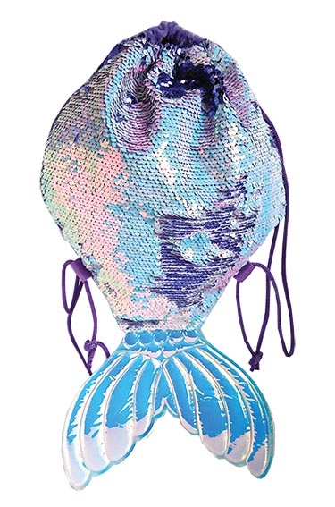 Worek MERMAID z dwustronnymi, mieniącymi się cekinami różowo-fioletowymi. Worek jest w kształcie rybki, zakończony mieniącym się kolorami ogonem. Worek ściągany jest na sznurki, które jednocześnie tworzą szelki, dzięki czemu worek da się założyć na plecy. Idealny na strój gimnastyczny, basen, czy szkolną wycieczkę.