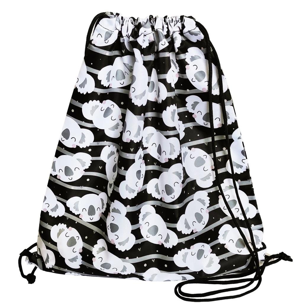 Worek szkolny na obuwie zmienne z możliwością założenia na plecy ( wzór: pyszczki misiów koala na czarnym tle w białe, cienkie pasy). Wymiar 35xh40cm.