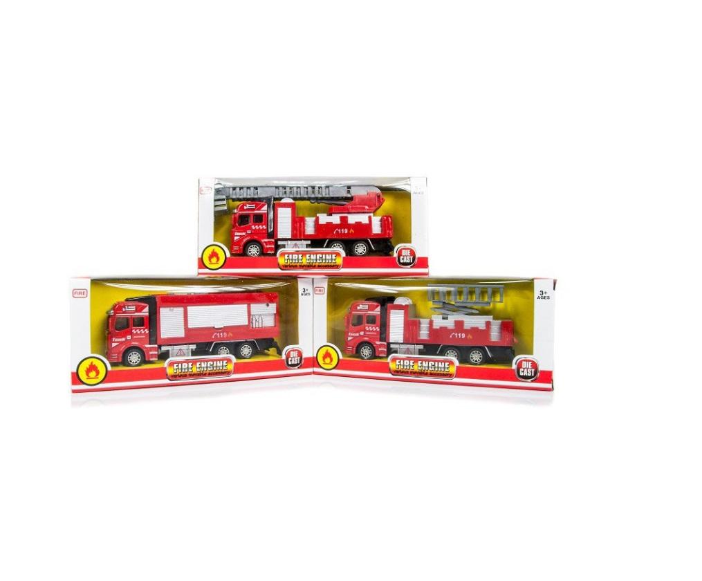 Model auta z napędem. Napęd pull-back (naciąg do tyłu). Model Wozu Strażackiego. Mix 3 wzorów - wysyłane losowo.