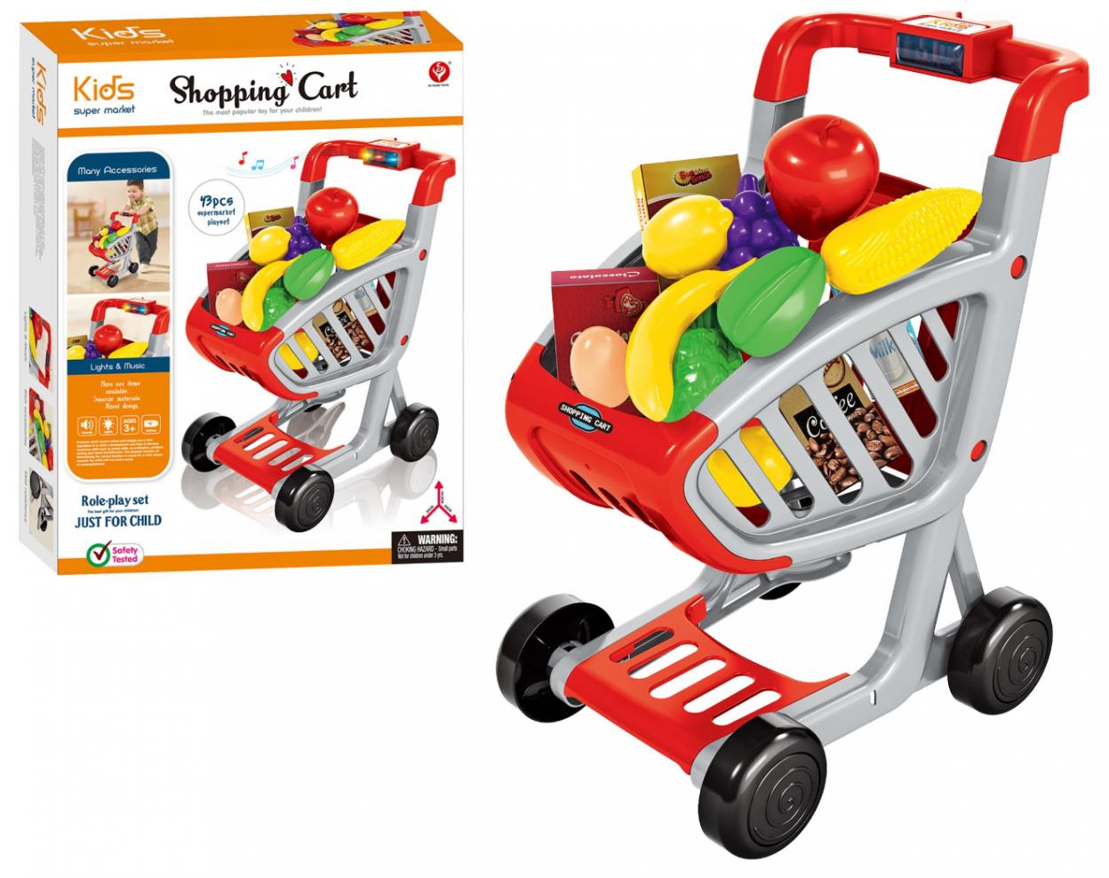 W skład zestawu wchodzi wózek, 28 sklepowych towarów (owoce, warzywa, jajka, ryba,