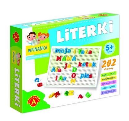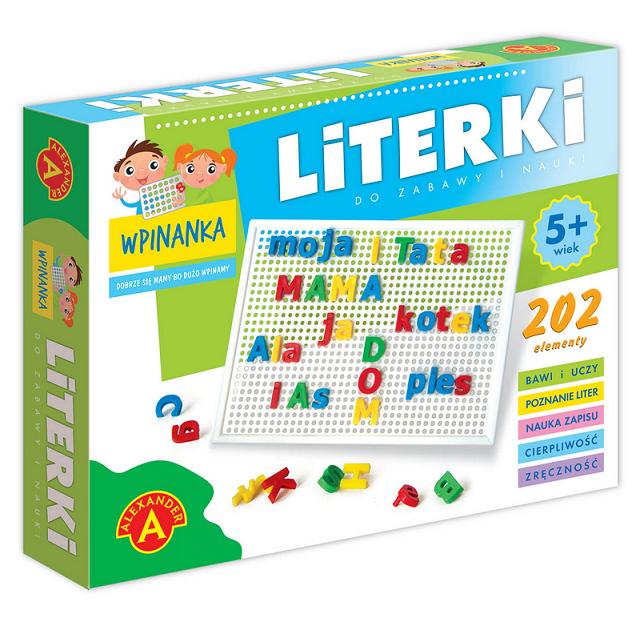 Zbiór kolorowych literek (zarówno wielkich jak i małych), z których każda posiada element umożliwiający wpinanie ich w otwory ażurowej tablicy.
