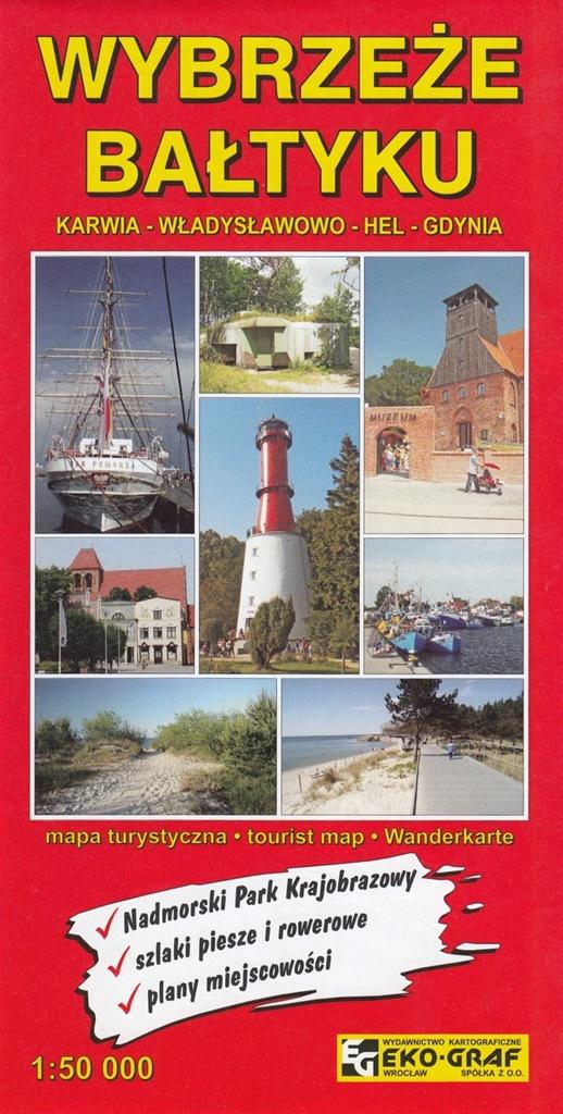 Mapa turystyczna wybrzeża Bałtyku obejmująca swym zasięgiem Karwię, Władysławowo, Hel, Gdynię, Jastarnię, Jastrzębią Górę, Puck.