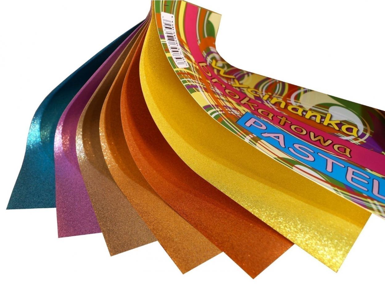 Zeszyt papierów brokatowych pastel w formacie A-4, Zawiera 6 różnokolorowych kartek z brokatem. Wycinanka.