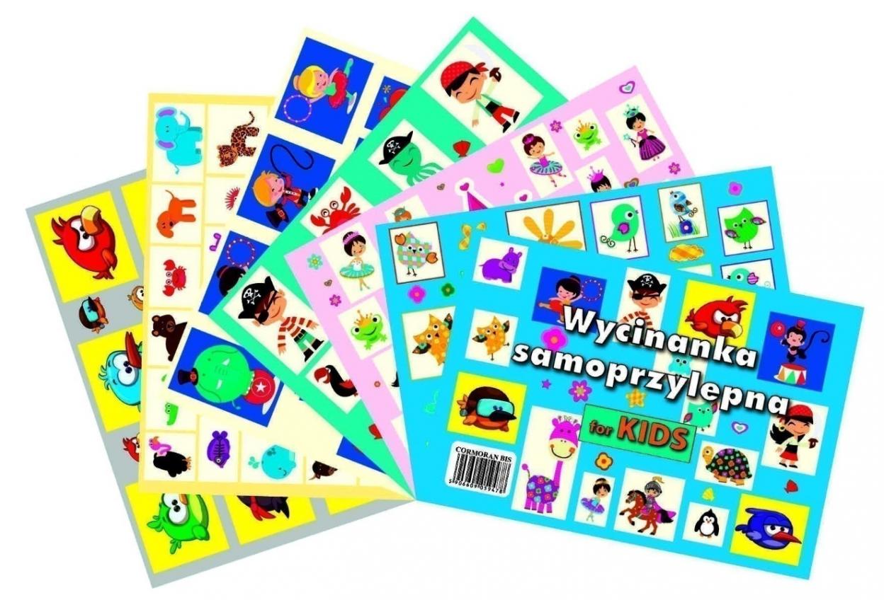Wycinanka papierów samoprzylepnych, zawiera 6 różnych kartek z obrazkami dla dzieci.