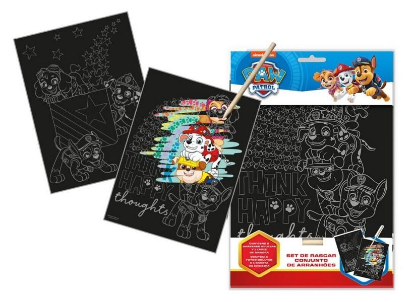 Zestaw kreatywny z ulubionymi bohaterami serialu Psi Patrol. • Zestaw do wydrapywania • Materiał: papier, drewno, • Wymiary: 28x20x1 cm • Zawartość: 2 obrazki do wydrapywania, patyczek