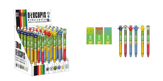 Wymazywalny niebieski tusz, cienka końcówka pisząca 0,5 mm umożliwiająca precyzyjne pisanie. Anatomicznie profilowany gumowy, antypoślizgowy grip zapewniający komfortowy chwyt i wygodne prowadzenie długopisu po kartce. Specjalna końcówka ścierająca w połączeniu ze specjalistycznym tuszem umożliwia łatwe wymazywanie napisanego tekstu, czy skorygowanie błędu. Gadżeciarski charakter długopisu sprawia, że pisanie jest nie tylko nauką, ale dobrą zabawą i czystą przyjemnością.