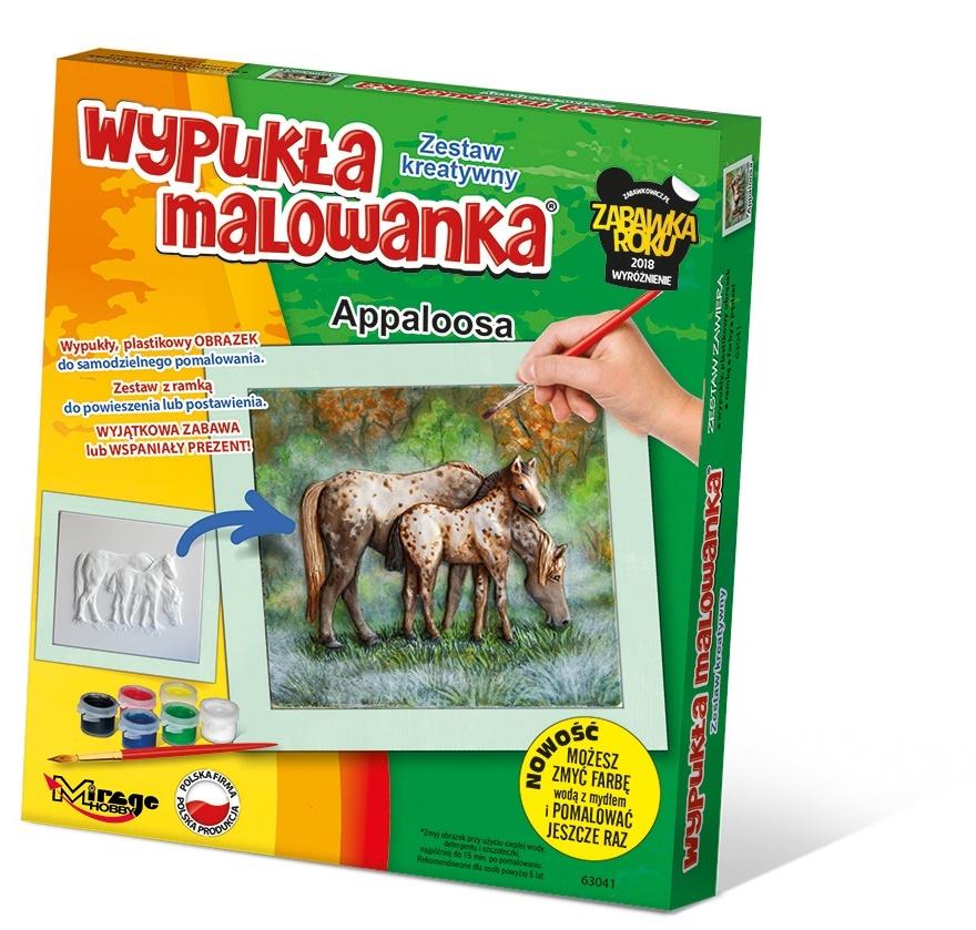 Wypukła Malowanka od Mirage Hobby to Zestaw Kreatywny do malowania dla osób powyżej 5. roku życia. Zestaw zawiera wypukły, plastikowy, kształtny obrazek 3D, farbki akrylowe, pędzelek oraz ramkę z kartonu do postawienia lub powieszenia. Zmyj obrazek przy użyciu ciepłej wody, mydła i szczoteczki, najpóźniej do 15 min. po pomalowaniu. Obrazek ma odpowiedni do wzoru wypukły kształt 3D, który jest dobrze odczuwalny w dotyku. Produkt jest wymyślony i wyprodukowany w Polsce! Wszelkie prawa zastrzeżone. Każda Wypukła Malowanka to konkretny wzór z danej serii. Kolekcja jest podzielona na różne serie np. Koty, Psy, Konie, Futrzaki, Dinozaury, Jednorożce, Kwiaty, Sport, Bajki, Zoo, Las, Taniec i inne. Seria Wypukła Malowanka Zestaw Kreatywny została nagrodzona Wyróżnieniem Zabawka Roku 2018.