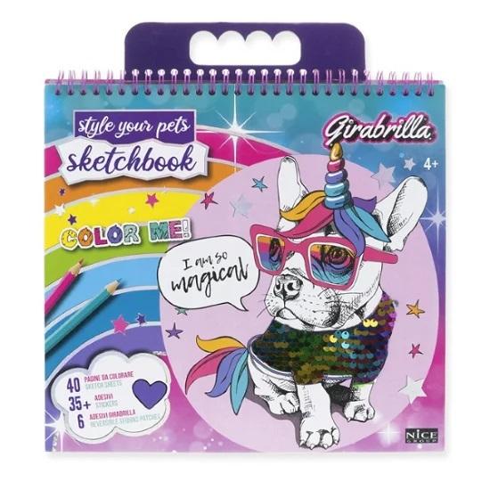 Produkt zawiera: modele sukienek Girabrilla w odwracalne cekiny, 40 stron, naklejki oraz 6 sukienek.