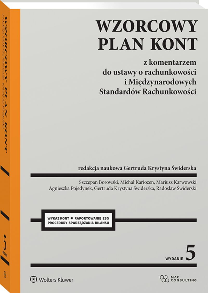 Opracowanie zawiera wykaz kont dla jednostek stosujących ustawę o rachunkowości oraz wykaz kont dla jednostek stosujących Międzynarodowe Standardy Sprawozdawczości Finansowej. W obszernym komentarzu do każdego zespołu kont przedstawiono definicje, podstawowe pojęcia, zasady wyceny wraz z omówieniem różnic między MSSF/MSR a ustawą o rachunkowości. Publikacja zawiera wiele przykładów ilustrujących szczególnie trudne zagadnienia. Główne części publikacji to: wykaz kont syntetycznych w zakresie, który pozwala ująć wszystkie zdarzenia w sposób umożliwiający sporządzenie sprawozdania finansowego w kształcie wymaganym przez ustawę o rachunkowości oraz Międzynarodowe Standardy Sprawozdawczości Finansowej; komentarz do każdego zespołu kont obejmujących część wprowadzającą oraz szczegółowe wyjaśnienia do poszczególnych kont; szczegółowe wyjaśnienia dla każdego konta syntetycznego z typowymi zapisami księgowymi i wskazaniami do rozwinięcia analitycznego zapewniającego spełnienie wymagań związanych ze sporządzaniem bilansu (w tym informacji dodatkowej), klasyfikacji GUS, rozrachunku z budżetem; procedury sporządzania bilansu oraz rachunku zysków i strat na podstawie zawartego w opracowaniu planu kont. W obecnym wydaniu uwzględniono zmiany związane z aktualizacją przepisów ustawy o rachunkowości oraz dyrektyw Parlamentu Europejskiego i Rady dotyczących sprawozdawczości w zakresie zrównoważonego rozwoju (ESG). Uzupełniono konta o znaczniki wynikające z faktu, że podatnicy będą zobowiązani do przesyłania zestawu elektronicznych danych do organów skarbowych w formie jednolitego pliku kontrolnego JPK_ KR_PD. Omówiono również obowiązki sprawozdawcze inne niż sprawozdanie finansowe, czyli sprawozdanie z działalności obejmujące sprawozdawczość zrównoważonego rozwoju, sprawozdanie z płatności na rzecz administracji publicznej i sprawozdanie o podatku dochodowym. Wzorcowy plan kont został przygotowany przez zespół ekspertów łączących doświadczenie praktyczne z dorobkiem naukowym oraz uczestnictwem w pracach legislacyjnych nad prawem finansowym. Publikacja adresowana jest do jednostek prowadzących zarobkową działalność wytwórczą, usługową i handlową, stosujących ustawę o rachunkowości oraz jednostek, które stosują lub zamierzają stosować Międzynarodowe Standardy Rachunkowości, Międzynarodowe Standardy Sprawozdawczości Finansowej oraz związane z nimi interpretacje ogłoszone w formie rozporządzeń Komisji Europejskiej, zwanymi dalej "MSR".