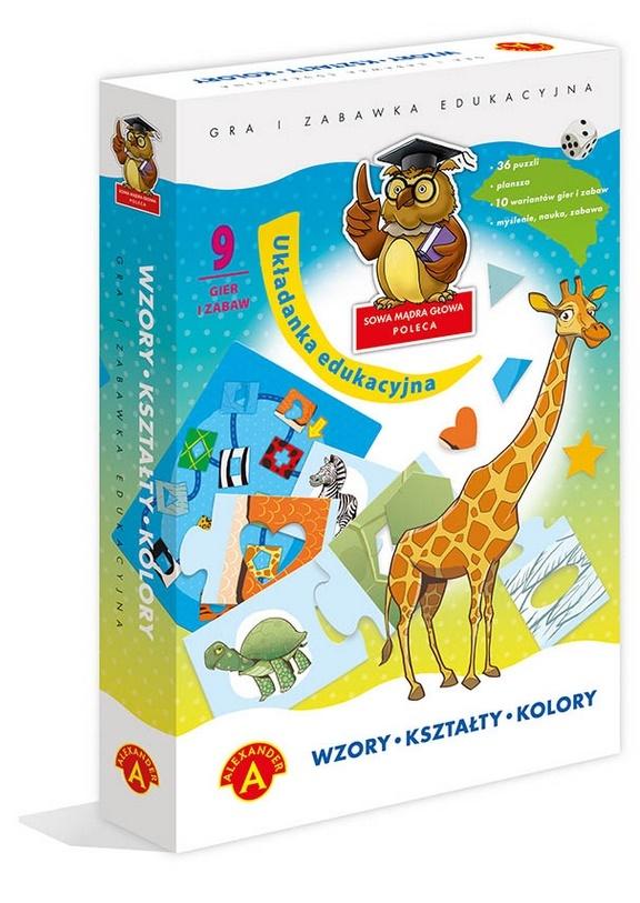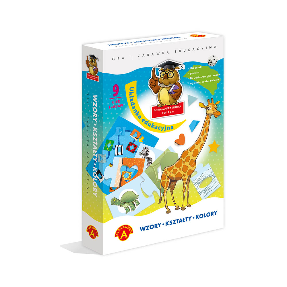 "Wzory kształty kolory" to świetna zabawa i jednocześnie pomoc dydaktyczna dla dzieci w wieku przedszkolnym. Pudełko zawiera 12 kompletów puzzli, które składają się z trzech pasujących do siebie tematycznie obrazków. Warianty zabawy, podczas których należy na różny sposób skojarzyć obrazki, uczą dzieci koncentracji, rozwijają logiczne myślenie, pamięć, wyobraźnię oraz sprawność manualną. Dzieci mogą bawić się indywidualnie lub w większym gronie. Dobrze jesziw zabawie towarzyszy dzieciom opiekun, który wskazuje różne wersje zabawy i pomaga dzieciom w trudniejszych zadaniach. Zawartość pudełka: 36 puzzli, plansza, pionek, kostka, instrukcja.
