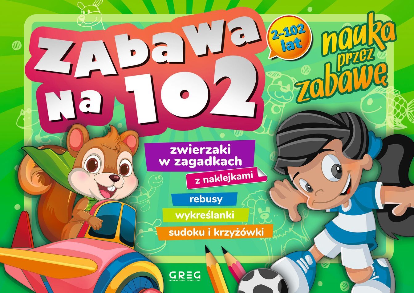 Zabawa na 102 to kolorowa, pełna łamigłówek i zagadek książka z naklejkami dla każdego dziecka właściwie bez ograniczeń wiekowych. Znajdują się w niej zadania zarówno dla przedszkolaków, jak i dla dzieci umiejących już czytać i sprawnie liczyć. Ta książeczka może „rosnąć” razem z dzieckiem - wraz z wiekiem rosną możliwości rozwiązywania coraz trudniejszych zadań. Zagadkę o kotku, piesku czy koguciku rozwiąże już niejeden czterolatek, a sudoku czy szukanie ukrytych kształtów skusi starsze rodzeństwo, a nawet babcię lub dziadka. Wspólna zabawa na 102 gwarantowana!