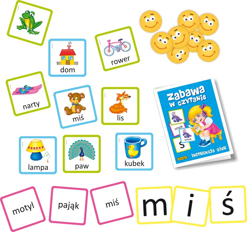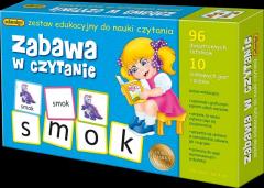 Podczas gry w „Zabawę w czytanie” dzieci zapoznają się z graficznym zapisem całych wyrazów, kojarząc je z obrazkiem, przedstawiającym przedmioty i postacie. Atrakcyjna forma zabawy zachęca dziecko do analizowania zapisu graficznego i wyodrębniania liter, a potem do tworzenia z nich nowych wyrazów.