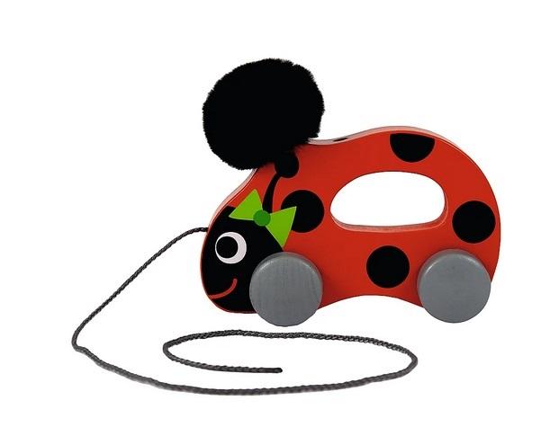 Biedronka Ilonka to zabawka, która wykonana została z jasnego, naturalnego drewna. Jest doskonałą zabawką, która towarzyszy najmłodszym przy stawianiu pierwszych kroków. Znakomite rozwiązanie dla dzieci od 12 miesiąca życia. Zabawka zachęca do wspólych spacerów, rozwijając dodatkowo odruch chwytania, dzięki ergonomicznemu kształtowi zaprojektowanemu specjalnie dla małych rączek. Biedronaka Ilonka wyposażona jest w sznureczek i małe drewniane kółeczka, dzięki którym zawsze podąża za swoim opiekunem. Zabawka posiada miły i puszysty pompon, który wspiera rozwój sensoryczny dziecka poprzez dotyk. Wszystkie materiały wykorzystane do stworzenia zabawki posiadają atesty, a także zostały pomalowane nietoksycznymi farbami.