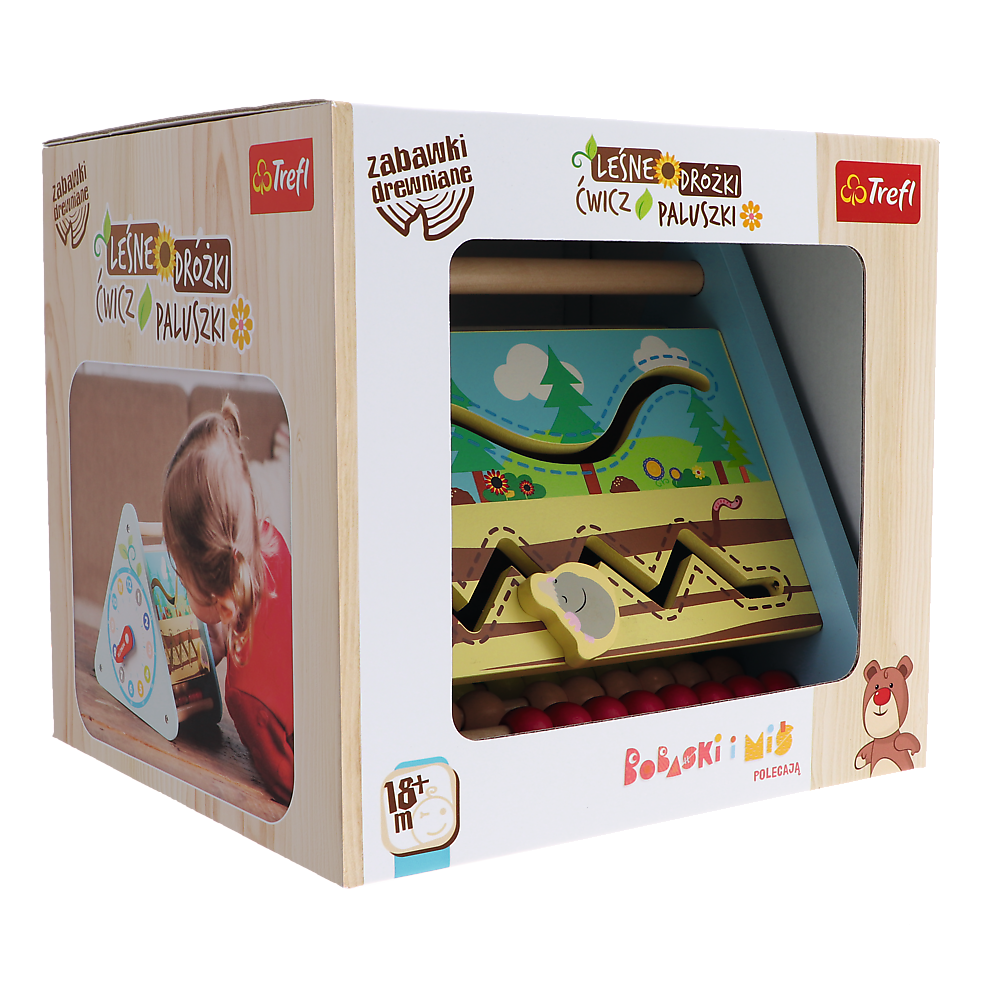 Leśne Dróżki Ćwicz Paluszki to drewniany box aktywacyjny składający się z 5 ścianek. Każda ścianka to nowe wyzwanie: mechanizm zębatkowy, zegar, tor do przesuwania zwierzątek, lusterko oraz liczydło. Zabawka drewniana wspomaga rozwój motoryki małych paluszków, wzmacnia koordynację wzrokoworuchową oraz aktywizuje dziecko do zabawy. Rozwija naukę zręczności oraz liczenia. Doskonałe rozwiązanie dla dzieci już od 18 miesiąca życia!