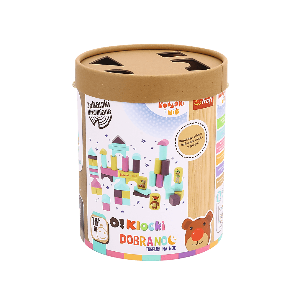 Edukacyjny zestaw 53 kolorowych klocków stworzony we współpracy z psychologiem, z myślą o potrzebach najmłodszych. Kolorystyka klocków zgodna z kolorystyką symboli z książeczek Dobranoc Trefliki Na Noc. Każdy kolor odpowiada za daną czynność, do wykonania przed pójściem