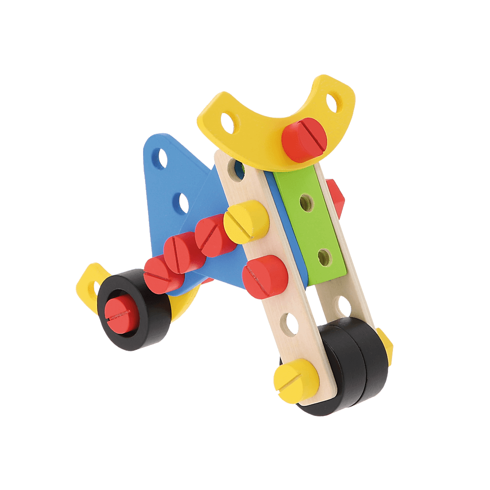 W zestawie 35 elementów: klocki, śrubki i narzędzia oraz manual z propozycjami złożenia wielu różnorodnych konstrukcji.