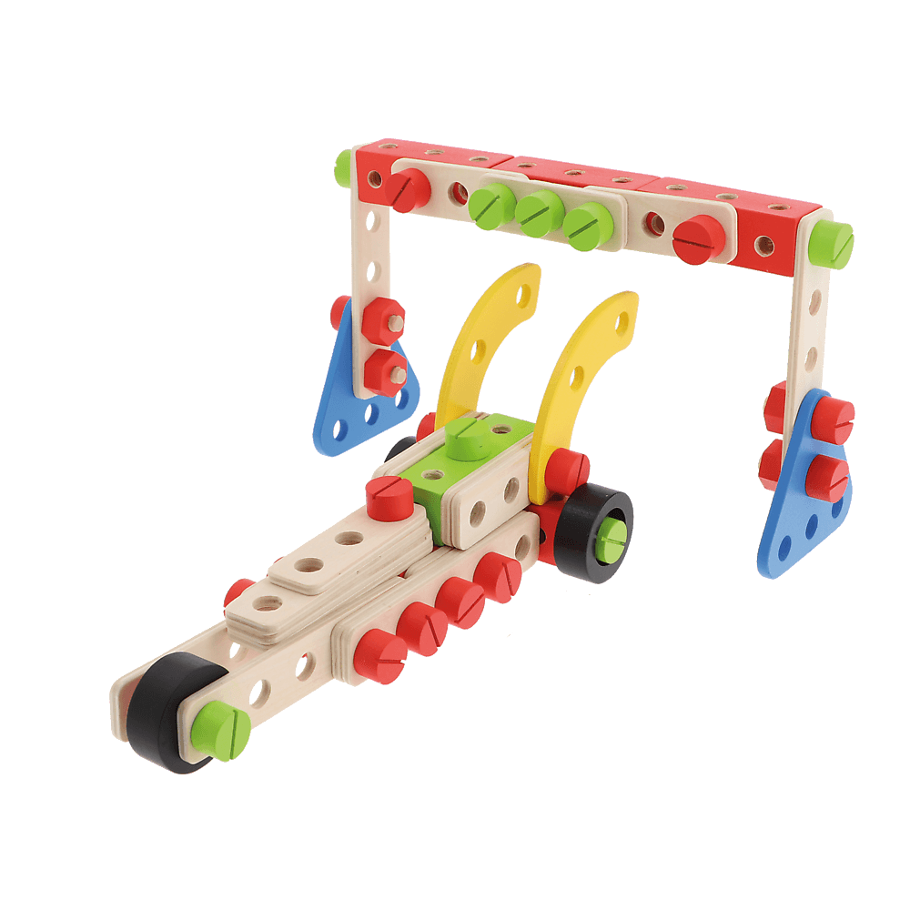 W zestawie aż 95 elementów: klocki, śrubki i narzędzia oraz manual z propozycjami złożenia wielu różnorodnych konstrukcji.