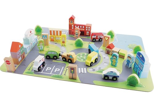 Edukacyjny zestaw 54 kolorowych klocków tematycznych z matą puzzlową, stworzony we współpracy z psychologiem, z myślą o potrzebach najmłodszych. Zbuduj miasto: straż pożarną, szpital, posterunek policji, kamienicę, sklepik W zestawie: 5 figurek postaci, 3 pojazdy uprzywilejowane oraz 2 pojazdy z połączeniem magnetycznym Drewniane klocki wspierają rozwój kreatywności, a figurki zachęcają do odgrywania ról. Mata puzzlowa o wymiarach 43x60 cm została zaprojektowana tak, by dziecko bawiąc się, rozwijało umiejętności manipulacyjne rąk. Połącz zestaw z innymi zestawami z serii O!Klocki: FARMA, ZOO i WESOŁE MIASTECZKO! Maty stworzą spójną grafikę. Stwórz świat według własnej koncepcji!