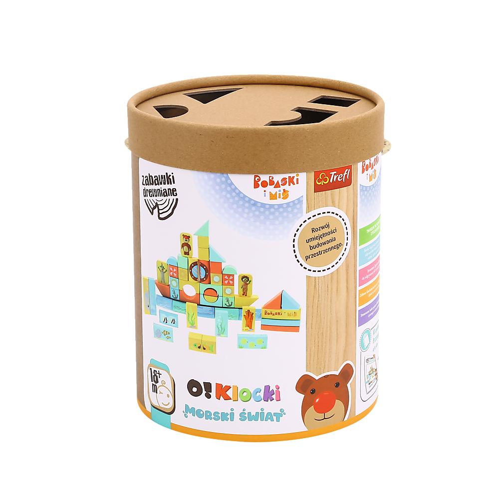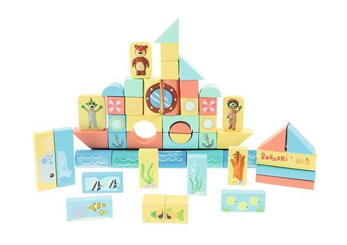 Edukacyjny zestaw 53 kolorowych klocków o tematyce morskiej stworzony we współpracy z psychologiem, z myślą o potrzebach najmłodszych.