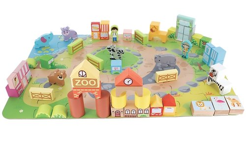 Edukacyjny zestaw 66 kolorowych klocków tematycznych z matą puzzlową, stworzony we współpracy z psychologiem, z myślą o potrzebach najmłodszych. Zbuduj zoo: kasy, sklepiki, wodospad, zagrodę dla zwierząt. W zestawie znajdziecie: 2 figurki postaci, 5 figurek zwierząt oraz 3 pieczątki ze śladami zwierząt. Kolejnym elementem zestawu jest mata puzzlowa o wymiarach 43x60 cm, która została zaprojektowana tak, by dziecko bawiąc się, rozwijało umiejętności manipulacyjne rąk. Drewniane klocki wspierają rozwój kreatywności, a figurki zachęcają do odgrywania ról. Połącz zestaw z innymi zestawami z serii O!Klocki: MIASTO, FARMA i WESOŁE MIASTECZKO! Maty stworzą spójną grafikę. Stwórz świat według własnej koncepcji.