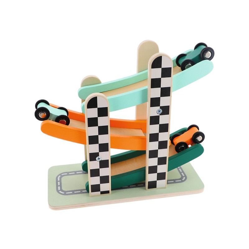 Drewniana wieża z trzema samochodzikami w zestawie, Zabawka dla dzieci w wieku od 18 miesięcy.