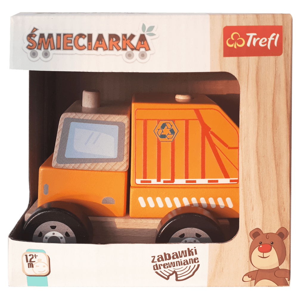 Śmieciarka, to zabawka drewniana, która rozwija zdolności motoryczne, wzmacnia odruch chwytania oraz uczy precyzji. Autko pobudza wyobraźnię, a także rozwija koordynację wzrokowo-ruchową. Posiada elementy ruchome. Wszystkie materiały wykorzystane do stworzenia zabawki posiadają atesty, a także zostały pomalowane nietoksycznymi farbami.